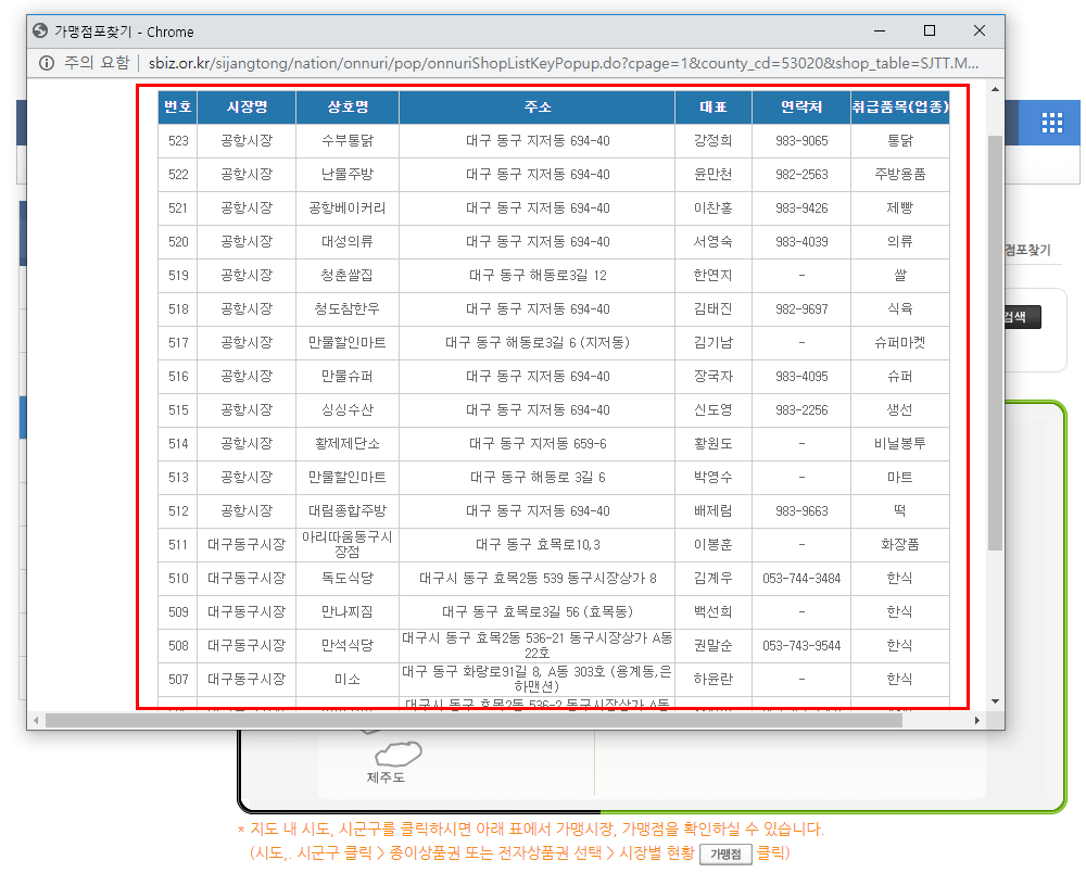가맹점포찾기를 통해 종이 상품권을 선택 후 시/도를 대구로 선택! 그리고 군/구를 선택하시고 검색을 누르시면 됩니다.
