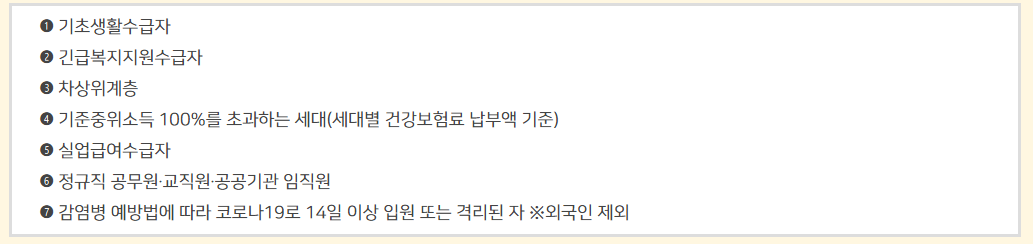 하지만 신청이 불가한 대상이 있습니다. 아래의 7가지 중 1개 이상 해당되는 가족이 있는 세대는 지원금 신청이 불가능 합니다.