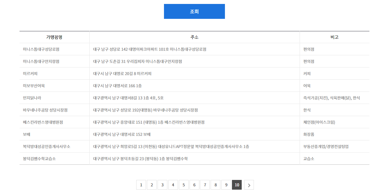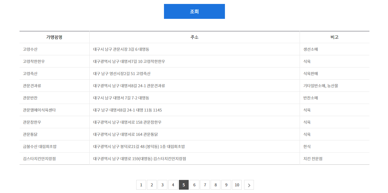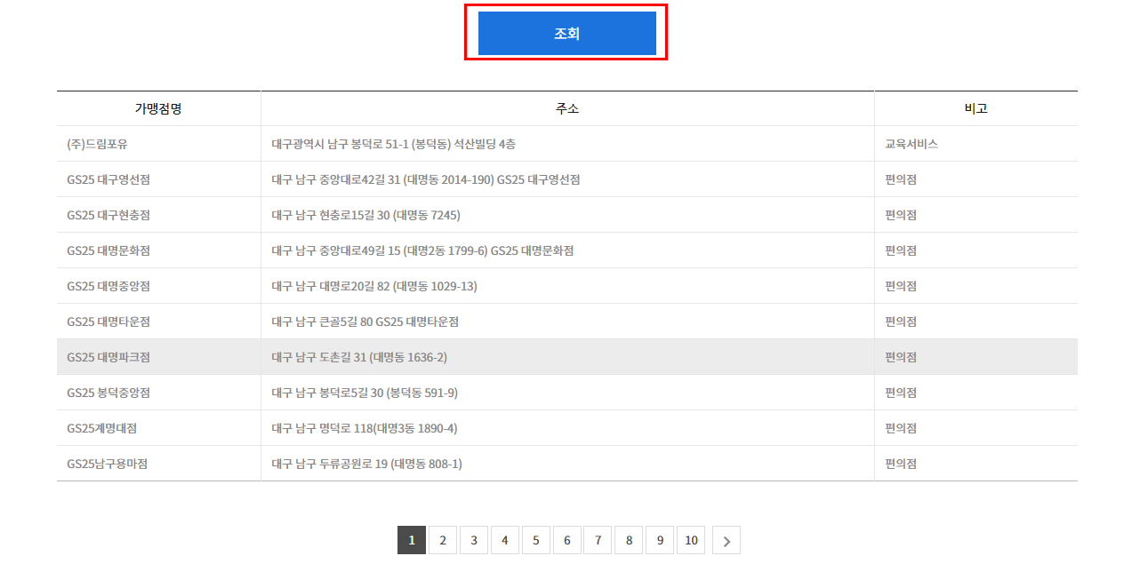 대구광역시를 시도로 선택해주시고 본인이 방문하시는 시군구를 선택해주시고 조회를 클릭해주세요. 저는 남구를 조회해보도록 하겠습니다.