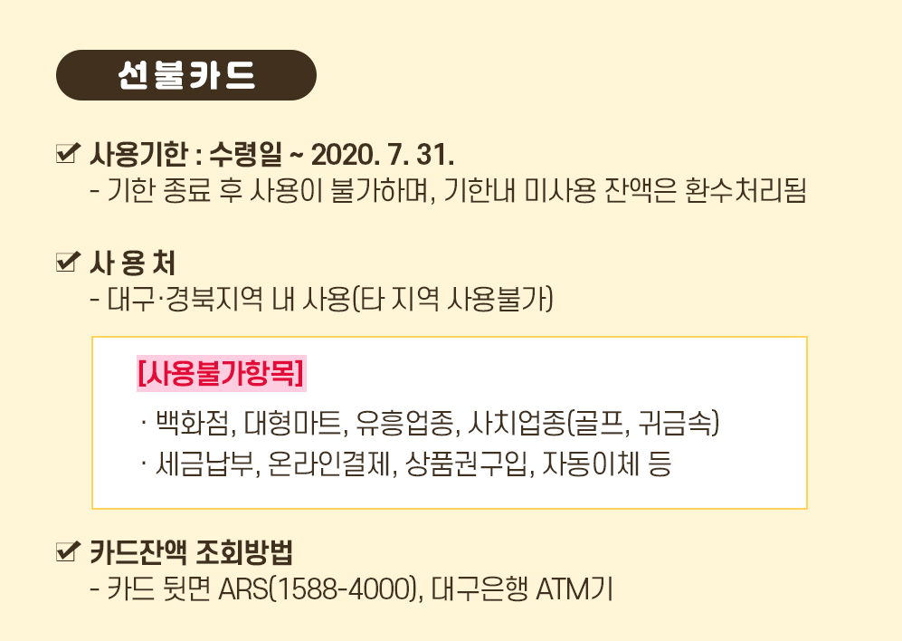 선불카드는 대구 경북내 사용이 가능 합니다. 다만 온라인에서는 사용이 불가능 하며 업종과 업태 제한이 있습니다. 제한 업종과 업태는 유흥업종, 사행업종, 백화점, 대형마트, 프렌차이즈 입니다.