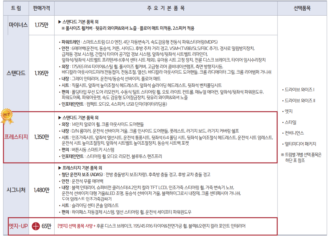 마이너스 - 11,750,000원 ▶스탠다드 기본 품목 외 풀 사이즈 휠커버/뒷유리 와이퍼&와셔 노즐 플로어 매트 미적용