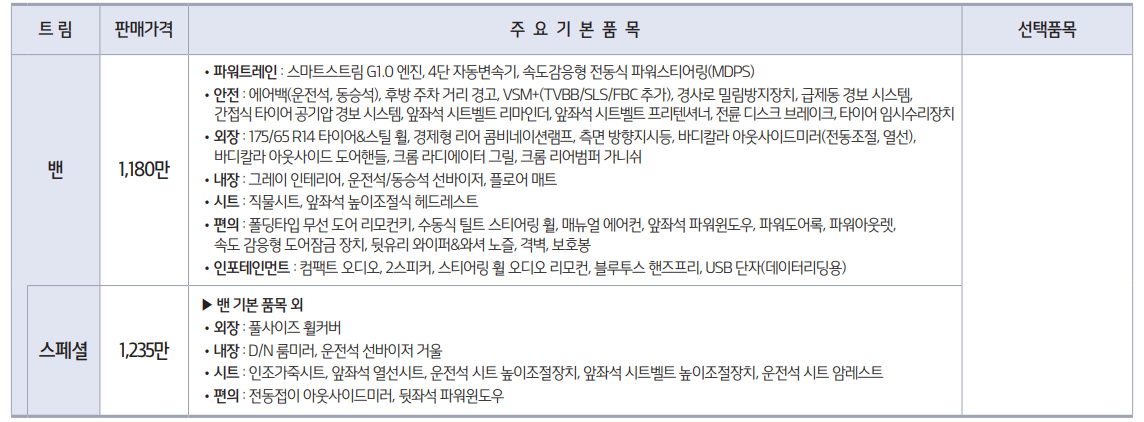 밴 - 11,800,000원 ▶1.0 가솔린의 스탠다드를 기본 품목으로 합니다.