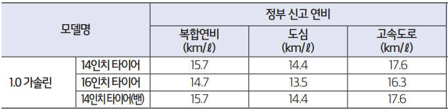 이번엔 경차의 가장 큰 장점인 연비에 대해서 알아 보도록 하겠습니다. 타이어에 따라 약간의 차이는 있지만, 트림별로 큰 차이가 없습니다. 하단의 이미지를 봐주시기 바랍니다.