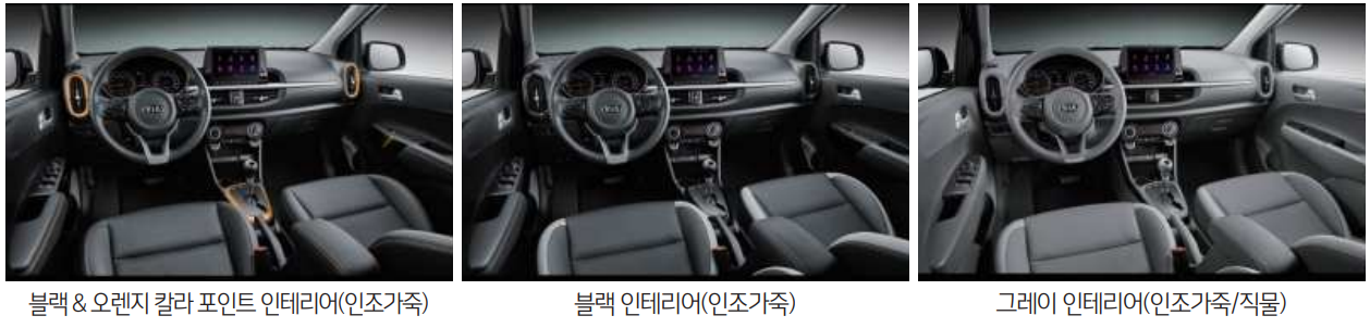 이번 에는 모닝 어반 내부색상 및 인테리어 입니다. 총 3가지로 선택이 가능 합니다. 블랙&오렌지 칼라 포인트 인테리어(인조가죽), 블랙 인테리어(인조가죽), 그레이 인테리어(인조가죽/직물) 입니다. 하단에서 상세 이미지로 자세히 알아보겠습니다.