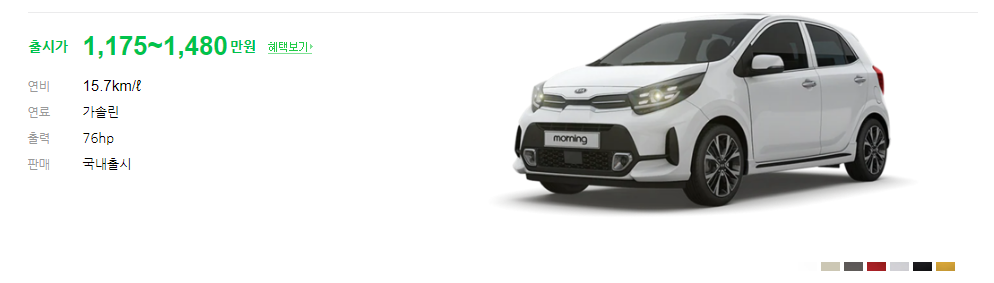 모닝 어반 출시가는 1,175~1,480만원 입니다. 트림별 차이가 있는데 하단에서 확인 하겠습니다. 연비는 경차 답게 1.57km/l 이며 연료방식은 가솔린 방식만 있습니다.