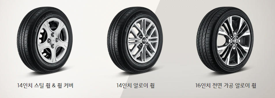 복합연비를 보시면 되는데 16인치 타이어의 경우는 14.7km/l 입니다. 나머지는 15.7km/l 입니다. 다음은 휠 정보 입니다. 총 3가지 입니다. 16인치 전면가공 휠, 14인치 스틸 휠&풀사이즈 휠커버, 14인치 알로이 휠 입니다.