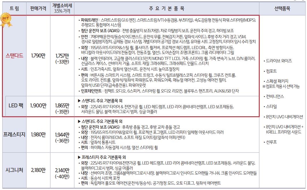 1.6 가솔린 트림 종류는 스탠다드(+LED팩), 프레스티지, 시그니처 입니다. 하단에서 상세 트림별 가격 및 내용 확인 해 보겠습니다.