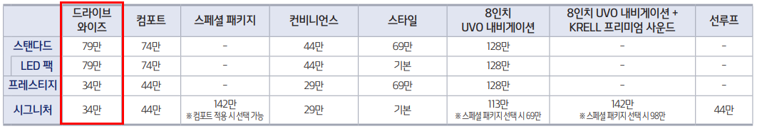 개인적으로 드라이브 와이즈를 추천 드립니다. 스탠다드 트림에 해당 옵션을 추가 하시면 고사양 트림의 차량처럼 사용하실 수 있습니다.