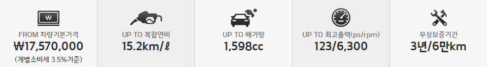 1.6 가솔린 터보 모델은 기본 모델보다는 다소 연비가 떨어집니다. 연비를 신경쓰시는 분들은 위의 표를 잘 참고 하시기 바랍니다. 1.6 가솔린은 15.2km/l, 1.6가솔린 터보는 약 12.1km/l 의 연비가 나옵니다.